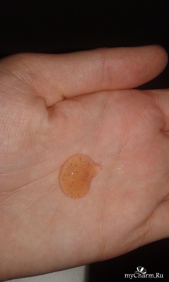 По консистенции — это жидкий гель бледно-оранжевого цвета с мелкими абразивными частицами. Пахнет очень приятно, ненавязчиво, как детская жвачка. При применении не царапает кожу. И кстати о применении: нужно необходимое количество скраба нанести на влажную кожу, помассировав слегка и оставить на пару минут, затем смыть теплой водой. Я старалась пользоваться скрабом не чаще 2-3 раз в неделю, и желательно после бани, так как кожа как раз распарена лучшим образом. Но можно и в обычных условиях, то бишь в ванной. При применении нужно достаточно обильное количество скраба. Ощущения после очищения этим скрабом очень приятные, чувствуется, что кожа мягкая, гладкая, как и обещает производитель.