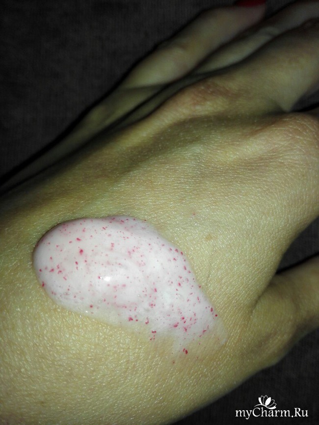 Цвет самого средства нежно-розовый, частичек - красный. Довольно приятно смотрится.