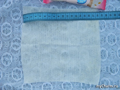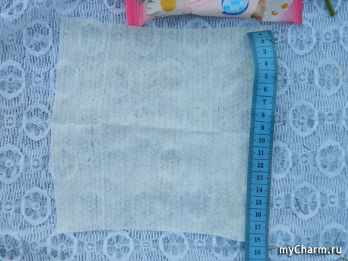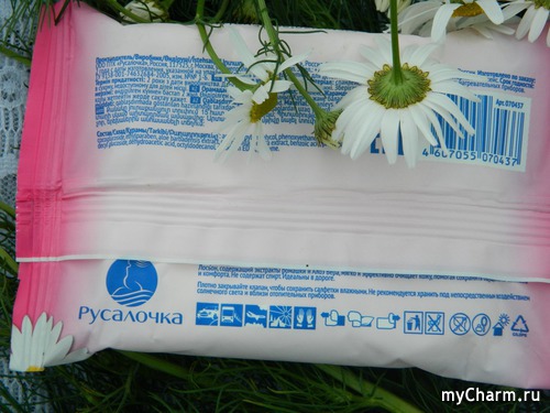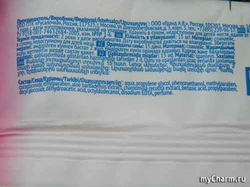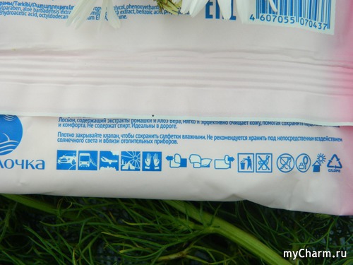 Обычные белые салфетки из спанлейса – нетканого текстильного материала, изготавливаемого из натуральных (лён, хлопок, шерсть) и химических (вискоза, полиэфир, полипропилен) волокон. Салфетки пропитаны лосьоном, в составе которого, как я уже отмечала, имеются экстракты ромашки и алоэ, а также – целый комплекс «химии», к сожалению, не такой полезной, как хотелось бы.