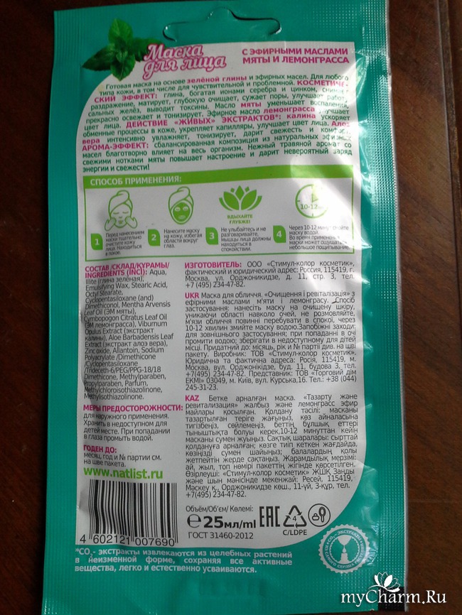 В состав данной маски также входят эфирные масла мяты и лемонграсса. Обе эти травки нежно люблю. Часто завариваю себе мятный чай по вечерам, он прекрасно успокаивает нервы. А у лемонграсса прекрасный тонизирующий аромат. Эти масла улучшают цвет лица, тонизируют кожу. Эфирное мятное масло — самое легкое из всех, содержащих ментол. Его преимущество универсальность - оно подходит для всех типов кожи. Правда, особенно хорошо воздействует на жирную кожу, усиливая действие зеленой глины – подсушивает воспаление, убирает бактериальный дерматит за несколько сеансов, устраняет первые признаки экземы. А масло лемонграсса содействует раскупорке и очистке пор, нормализует жировой баланс кожи, устраняет черные точки. Как видим, состав маски подобран просто идеально! Каждый компонент дополняет и усиливает друг друга! (Кстати, тут же вспомнилась западная музыкальная группа с этим поэтичным названием, «Лемонграсс», - такая релакс музыка, как раз под нее хорошо будет полежать с масочкой на лице!)