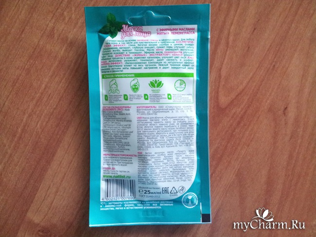 В один прекрасный день подошла очередь для тестирования маски с эфирными маслами мяты и лемограсса. Небольшая упаковка-саше зеленого цвета с изображением улыбающейся девушки в маске и с полотенцем на голове выглядит ярко и красиво. Внутри находится 25 мл готового косметического продукта. Такой объем, наверняка, очень удобно брать в отпуск, маски хватает на 4 раза. Очень практично и экономично, ведь маска стоит очень даже недорого. Если при покупке руководствоваться соотношением «цена-качество», то можно сказать, что производитель чуть ли не даром отдает свой продукт. Кстати, весь объем помещается в небольшой баночке, которая входит в набор для путешествий (недавно разыгрывался на Mycharm).
