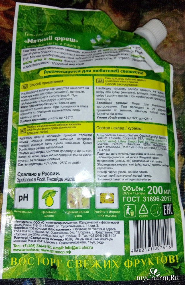 Вся информация по гелю (адрес производителя, электронный адрес сайта для совершения покупок, состав, срок годности, меры предосторожности) присутствует на обороте и выполнена для удобства на трёх языках. Это говорит о том, что продукция поставляется не только в российские города.