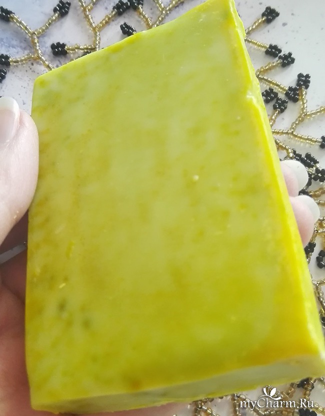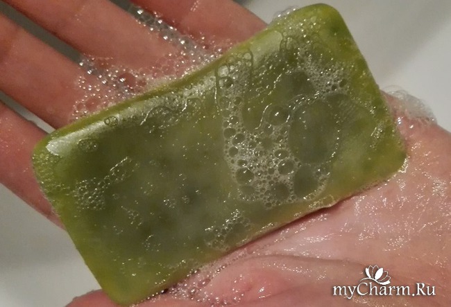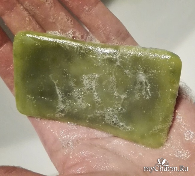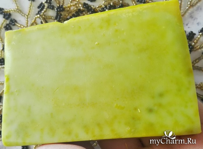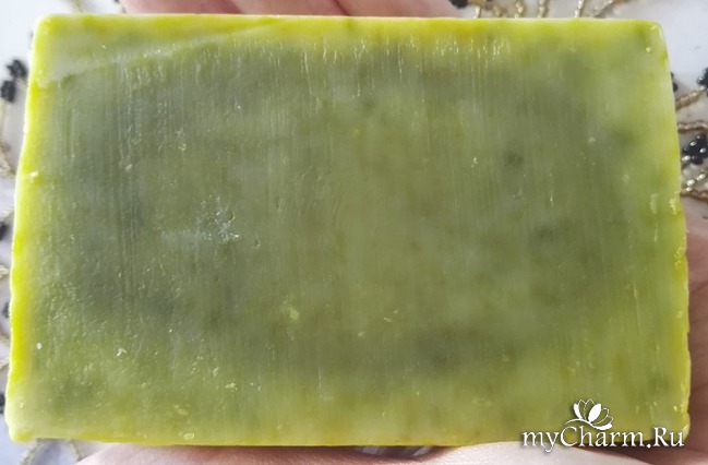 Само мыло неоднородной окраски, имеет приятно желто – зеленый оттенок. Ровный прямоугольный кусочек, удобно лежащий в руке.