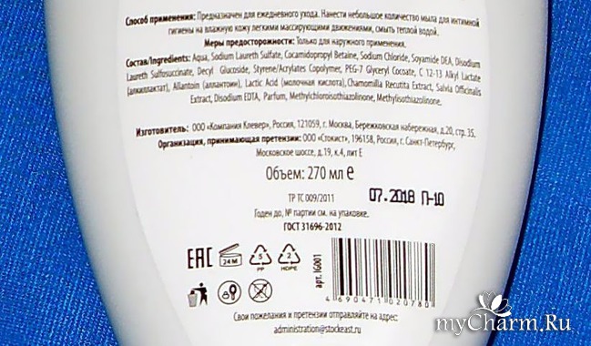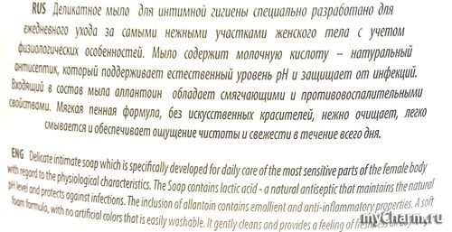 На лицевой стороне продукта мы видим, что перед нами мягкое средство для интимной гигиены. Оно создано не только для очищения кожи, но и поддержания естественного уровня рН, что важно в интимной гигиене для предупреждения многих женских заболеваний половой сферы.В составе средства имеется молочная кислота, о ее роли в косметике говорить не приходится, все знают ее преимущества. Замечу лишь, что «Лактацид», содержащий молочную кислоту, у меня вызвал аллергическую реакцию, а это средство нормально воспринялось организмом. Напрасно я много лет избегала покупать продукцию с молочной кислотой, «обжегшись» на «Лактациде».