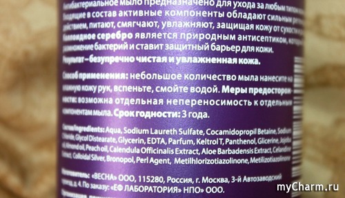 Мыло полупрозрачное и невероятно красивое. В каждой капле переливаются десятки блесточек. Они играют на свету разными цветами и поблескивают, а образовавшейся пенке придают искристость и торжественность. Ну и конечно, аромат. Он довольно ненавязчивый, с оттенками свежести и парфюма. В общем, мыть ручки это не только необходимость, но и удовольствие. А еще (если внимательно заглянуть в состав) это польза для кожи. Ведь данный продукт содержит: