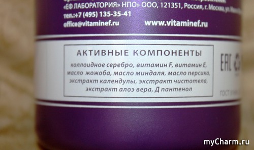 - коллоиное серебро (известный антисептик), витамин F, масла персика и миндаля, масло жожоба, экстракты алоэ, чистотела и календулы, пантенол.