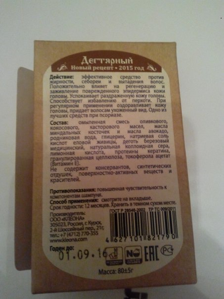 В составе шампуня есть березовый деготь, его получают из березовой коры. Это темная, вязкая и маслянистая жидкость со сложным химическим составом, имеющая резкий и неприятный запах. Его применяют при различных кожных заболеваниях, грибковых заболеваниях, болезнях суставов и пр. Перечень болезней, при которых деготь только на пользу, длинный.