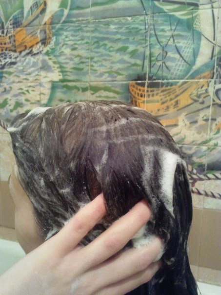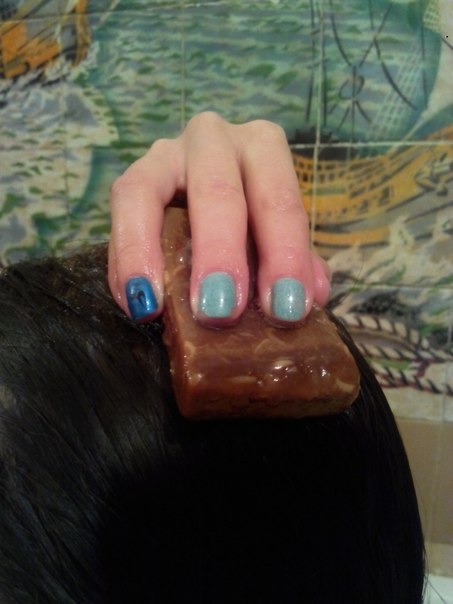 Намочим хорошенько волосы, берем мыло в руки и намыливаем им наши волосики.