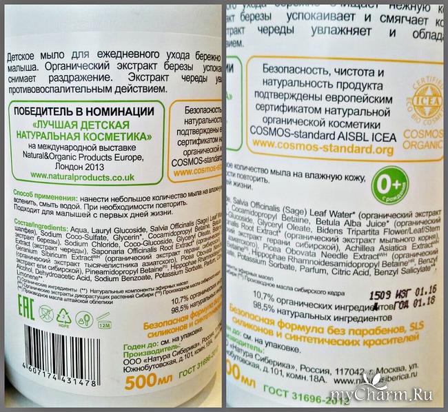 Удобная и большая бутыль (500 мл). Имеет удобный дозатор с предохранителем от случайного проливания или нажатие ребенком. На внешней стороне производитель четко утверждает, что детская косметика органическая и сертифицированная и немного ниже показывает знак качества.С обратной стороны детально описано все, что может интересовать о средстве. Сиберика уверенно ответит на любой Ваш вопрос: описание, сроки годности (1 год с момента открытия), состав, адрес и др.