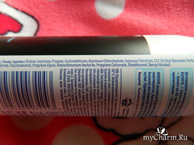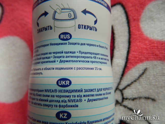 На «парадной» стороне флакона производитель заверяет, что средство не оставляет следов на чёрной и белой одежде и действует целых 48 часов. На обратной стороне флакона – более подробная информация. Здесь говорится, что средство не содержит спирта и красителей, и это отлично, плюс дезодорант дерматологически протестирован. Не знаю, как вам, а мне это нравится.