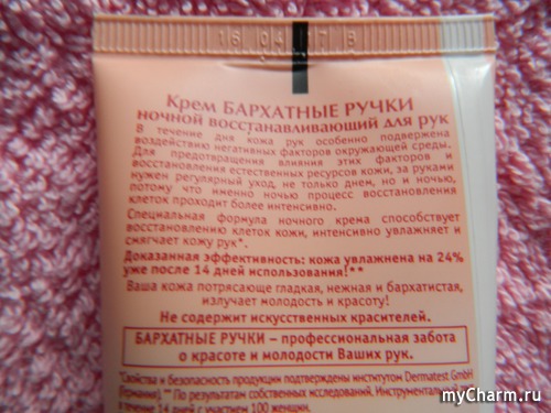 Крем помещён в мягкую тубу с откручивающейся крышечкой. Дизайн упаковки привычен и приятен глазу – типичный дизайн средств "Бархатные ручки". На внешней стороне значится назначение – ночной крем для рук. Здесь же заявлено, что средство прошло дерматологический контроль, и это вселяет уверенность в качестве. Здесь же обозначено, что крем стимулирует обновление клеток кожи и увлажняет. На первый взгляд кажется, что всё отлично.