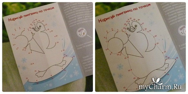 На обратной стороне листа – занимательное задание: соединить точки для получения изображения, что обычно очень нравится детям. Решили, что такой «симпатяшный» пингвиненок непременно должен получить имя. Зовется у нас он теперь Лоло, как из одноименного мультфильма.