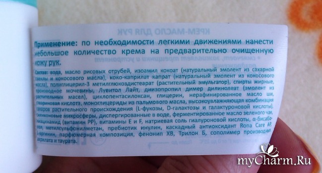 В составе: масло рисовых отрубей, масло ши, масло зеленого чая, пальмовое и кокосовое масло, витамины РР, Е, F, пребиотик инулин, L-аргинин и другие полезные вещества, помогающие в уходе за кожей рук.