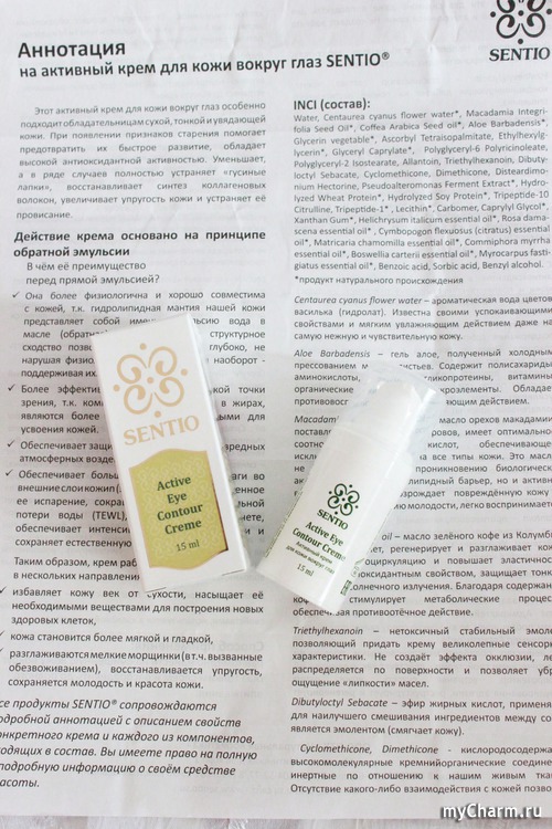 Как и все другие косметические продукты SENTIO, крем для области вокруг глаз сопровождается подробной аннотацией с описанием свойств, состава и каждого компонента входящего в него по отдельности. Поэтому не нужно тратить время на расшифровку тех или иных незнакомых ингредиентов, производитель постарался снабдить нас по максимуму всей интересующей информацией.