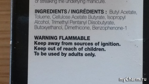 Прозрачная, густой консистенции жидкость, похожая на гель, который ровно и легко ложится на ноготь, покрывая его по всей длине мягкой кисточкой. Кисточка на мой взгляд длинновата, но ложится очень мягко, ровно, как зеркало покрывая ноготь, без всяких бороздок и полосочек. Средства лишнего не захватывает, лак не скатывает за собой. Практически без запаха, ею можно закреплять лак сразу, после нанесения последнего слоя. Высыхает практически сразу. В холодное время, года особенно ценишь такой момент, пальчики не синеют от холода, можно надеть перчатки и не бояться, что придешь с припечатанным маникюром.