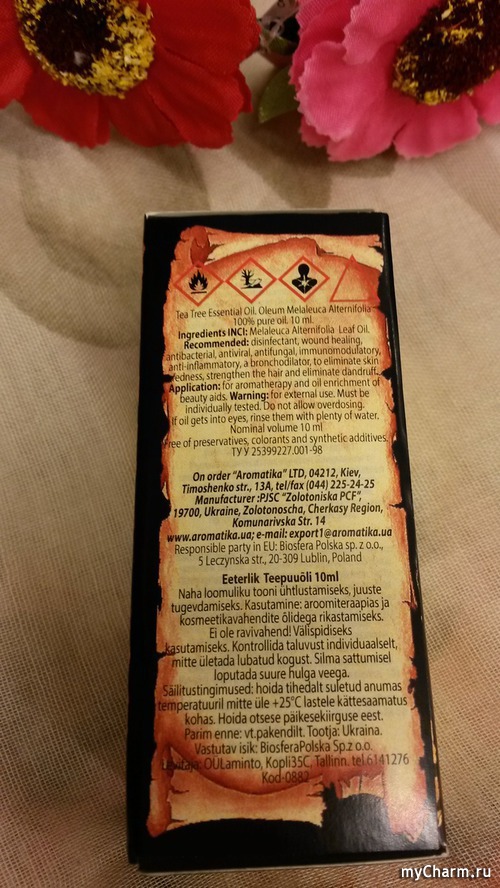 Для всех масел этого производителя дизайн упаковки один. Внутри находится стеклянная бутылочка из темного стекла, объемом 10 миллилитров. На бутылочке наклеена этикетка Эфирное масло чайного дерева.