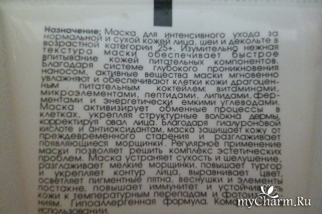 Продукт позиционируется как маска, предназначенная для ухода за кожей лица в рамках вышеуказанной возрастной категории. Рецептура средства разработана с учетом потребностей сухой и нормальной кожи лица, шеи и зоны декольте.