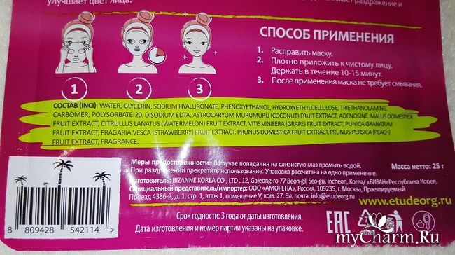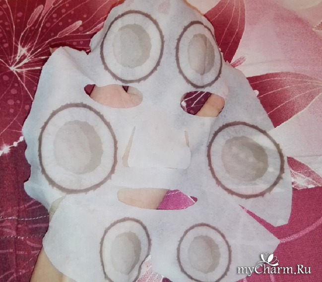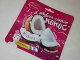 Маска на тканевой основе, обильно пропитана сывороткой с кокосовым экстрактом. Ткань очень тонкая на ощупь, легкая и украшена рисунком кокосов. Что тут говорить, на такую маску приятно смотреть и не стыдно перед родственниками в ней ходить, а не прятаться в ванной комнате.