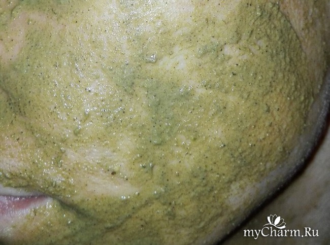 Итак, я залила сухую смесь, остудила и нанесла эту зеленую кашицу на мокрую кожу лица.