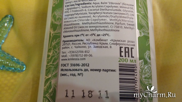 Произведена маска в Республике Крым на Комбинате с красивым названием "Крымская роза" по ГОСТу. Использовать масочку нужно до ноября 2018 года. Здесь же можно увидеть состав маски. Хранить ее нужно при температуре от +5 до +25 градусов. Объем 200 мл.
