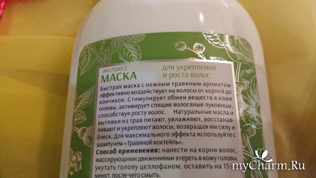 На обратной стороне наклеена такая же гладенькая этикетка с информацией о том, что же дает волосам эта маска. Так же производитель рекомендует для максимального эффекта маску использовать вместе с шампунем "Травяной коктейль" от Крымской розы, но была в наличии только маска. При случае обязательно и шампунь попробую.