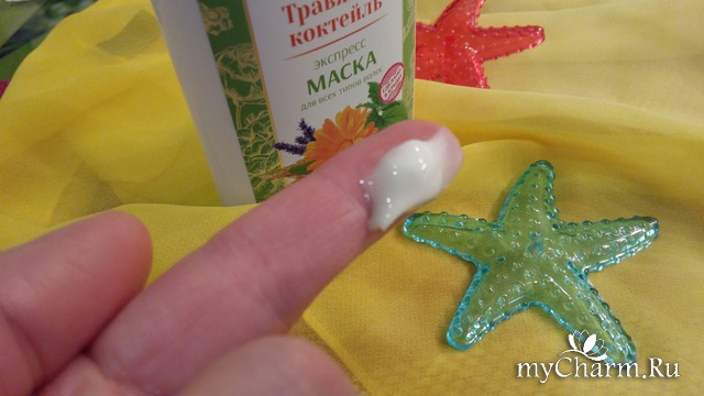 Маска нежной консистенции не очень густая, но и не растекается. На фото не очень заметно, но маска не белого цвета, а имеет еле уловимый нежно-зеленый цвет. Не зря маска называется "Травяной коктейль", она действительно пахнет травками, мне этот запах нравится.