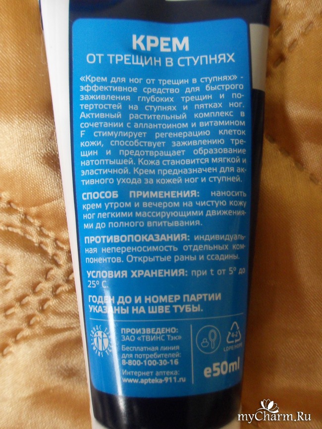 На обороте написаны свойства и способ применения данного средства. В составе крема имеются аллантоин и витамин F, именно они способствуют заживлению кожи ступней. Крем не рекомендуется наносить на открытые раны или ссадины. Противопоказаний к применению у меня не было.