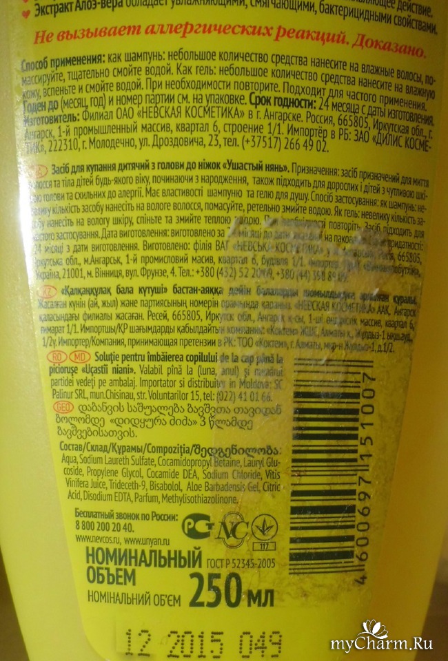 Средство идет в желтом флаконе с логотипом серии «Ушастый нянь». Красным цветом написано, что продукт не вызывает аллергических реакций. Меня не мог обрадовать тот факт, что средство называется «От головы до ножек». Значит, его можно использовать и в качестве шампуня, и в качестве пенки для купания. Снизу же указано, что средство с виноградом и алоэ.