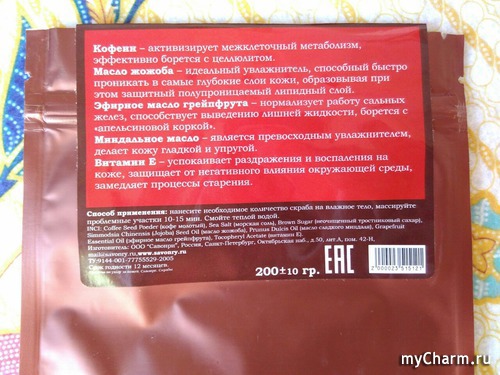 Стоит ли пробовать описать аромат этого скраба?! Он настолько бодрящий, и в то же время такой расслабляющий, вы просто не представляете! И никакого синтетического парфюма – это реальный аромат кофе с нотками грейпфрута. Пользоваться таким скрабом – одно удовольствие! Да, это и в самом деле "блаженство тела и души"!