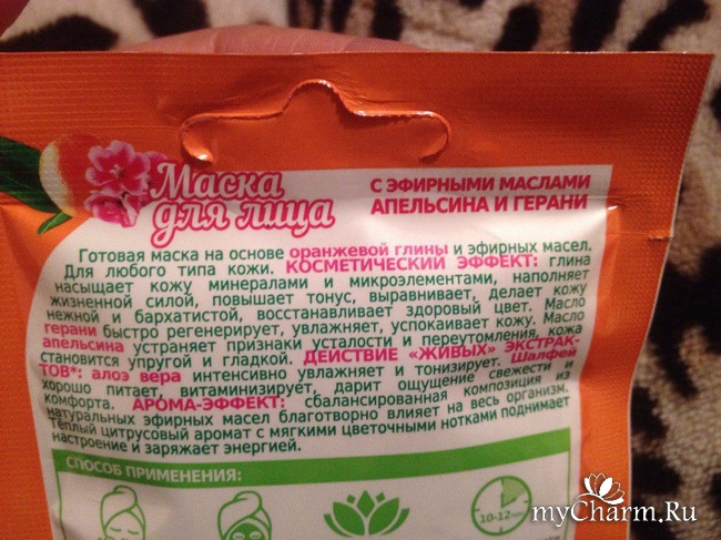В этот раз маска изготовлена из оранжевой глины и эфирных масел герани и апельсина. Запах должен быть очень вкусненьким! Какими же свойствами обладают эти компоненты?
