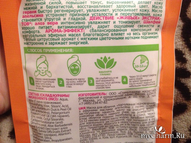 Упаковка данной маски очень яркая, жизнерадостная. Ярко-оранжевого цвета, с апельсинками! Я очень люблю апельсинки, а вы? На обратной стороне упаковки мы можем увидеть огромное количество информации о продукте. Я люблю читать составы и люблю, когда написано о продукте, для меня это плюс! Очень просто, интересно и понятно описан продукт. Прочитав только одну информацию, уже хочется скорей нанести на лицо!