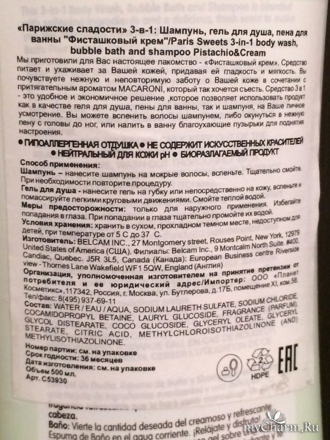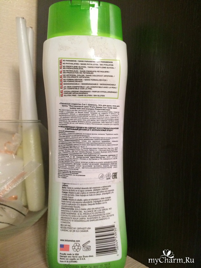 Теперь необходимо сказать о свойствах "3 в 1". Во-первых, можно пользоваться им как шампунем для мытья волос и кожи головы. Сразу скажу, что я пробовала его (средство) в качестве шампуня. Очищает волосы неплохо. Но бальзам я наношу после любого шампуня, так как только он помогает облегчить расчесывание и не допустить спутывание волос. В целом, с функцией очищения справляется нормально. Во-вторых, используется еще как гель-душа. И такое его свойство я тоже проверила. Опять же, очищает кожу, которая после водных процедур становится нежной, мягкой и гладкой. Никаких ощущений дискомфорта нет после использования, в том числе сухости. Пенится средство очень хорошо. Нужно совсем немного геля, получается экономное использование. В-третьих, "Парижские сладости" могут использоваться и как пена для ванны. Для меня это особый ритуал ароматерапии. В процессе наполнения ванны я наливаю не очень много средства, и пока она наливается до нужного мне уровня, пены становится все больше. Она (пена) не очень плотная, пузырьки быстро лопаются. Но пока они все испарятся, уже как раз заканчиваешь свое пенное наслаждение!