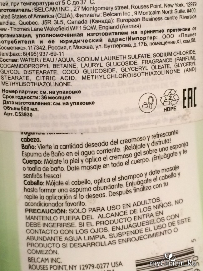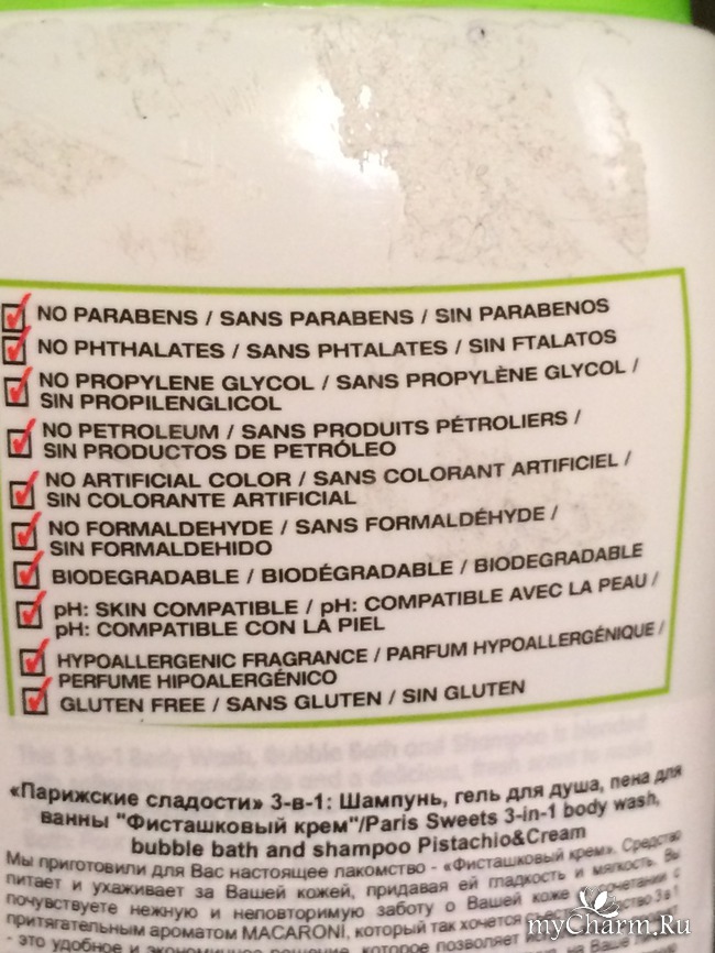 Состав меня очень обрадовал. Очень много радующих глаз галочек. Нет вредных парабенов, фталатов, формальдегидов, пропилен гликоля, продуктов нефтепереработки и глютена. Хотя и имеется отдушка, но она гипоаллергенна. Нет красителей, и еще один плюсик ко всему - нейтральный pH, который не будет сушить вашу кожу. Считаю, что использование средства явно безопасное.