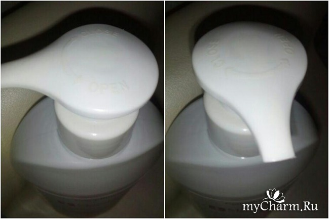 Белая баночка с черными и розовыми надписями. Ничего лишнего, ничего не отвлекает внимание. Закрывается емкость крышкой с дозатором. Чтобы случайно не нажать на дозатор, необходимо его "носик" повернуть на 90 градусов.