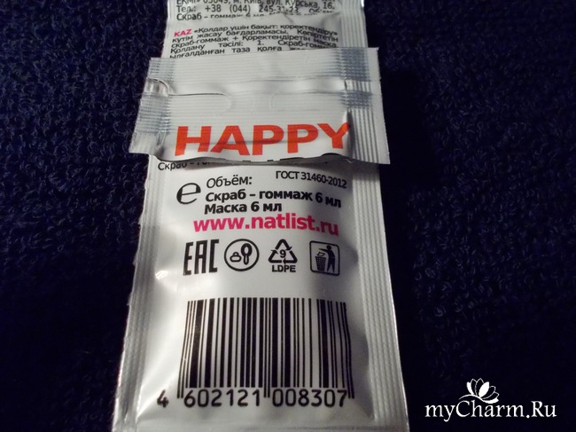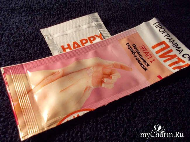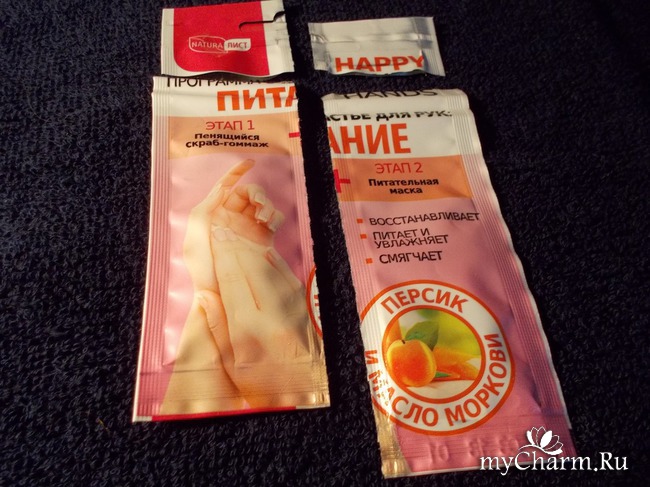 В Счастливую программу для рук, которое называется "Питание" входят: 1) Скраб, который является гоммажем, имеет лёгкую пенку; 2) Средство в виде маски, которое несёт питание нашей коже рук и снаружи, и изнутри. Косметический дуэт восстанавливает кожу, питает и увлажняет, смягчает. Как раз всё, что нам необходимо, чтобы наши ручки чувствовали себя здоровыми и красивыми.