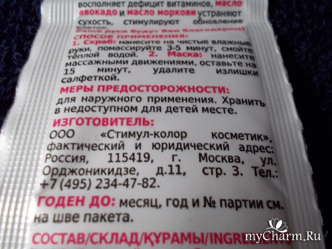 Само саше придумано так, что его можно повесить на крючок, как одно целое, и в то же самое время можно разделить на две половинки: на скраб, и маску. Сеанс рассчитан на два этапа, но его можно провести и по одному этапу. Когда ручки уже выглядят на все сто, то можно разбить пополам счастья кило, то есть наш пакетик процедур.