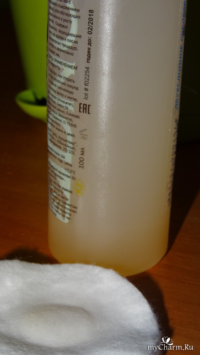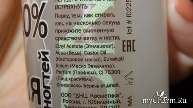 Хочется отметить, что именно этилацетат в составе жидкости отвечает за снятие лака и обезжиривание ногтевой пластины. При этом ацетона, пагубно влияющего на структуру ногтя, в составе нет.