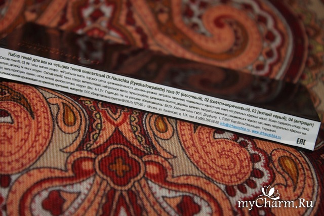 Тени представлены в черной лаковой палетке с золотой гравировкой бренда. На торце сзади есть этикеточка на русском языке. Там все достаточно мелко, но разборчиво. Можно прочесть состав, срок годности и координаты представителей Dr. Hauschka в России. Если владеете английским, то взгляните на дно палетки и прочтите эту же информацию.