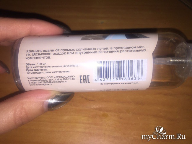 Немного о внешнем виде. Продукт находится в пластиковой бутылочке объемом 100 мл. Пластик прозрачный, содержимое хорошо видно. Этикетка выполнена в нежном бежевом цвете, даже блесточек немного добавили. На лицевой части этикетки написано, для чего этот продукт, ну и его название. На обороте маленький состав, срок годности и производитель.