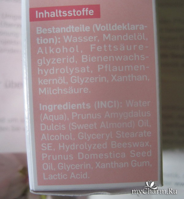 Состав крема просто потрясающий. Это вода, миндальное масло, спирт, козье молоко, гидролизированный пчелиный воск, масло сливовых косточек, глицерин, ксантан, или ксантановая камедь, лактоза, или молочный сахар.