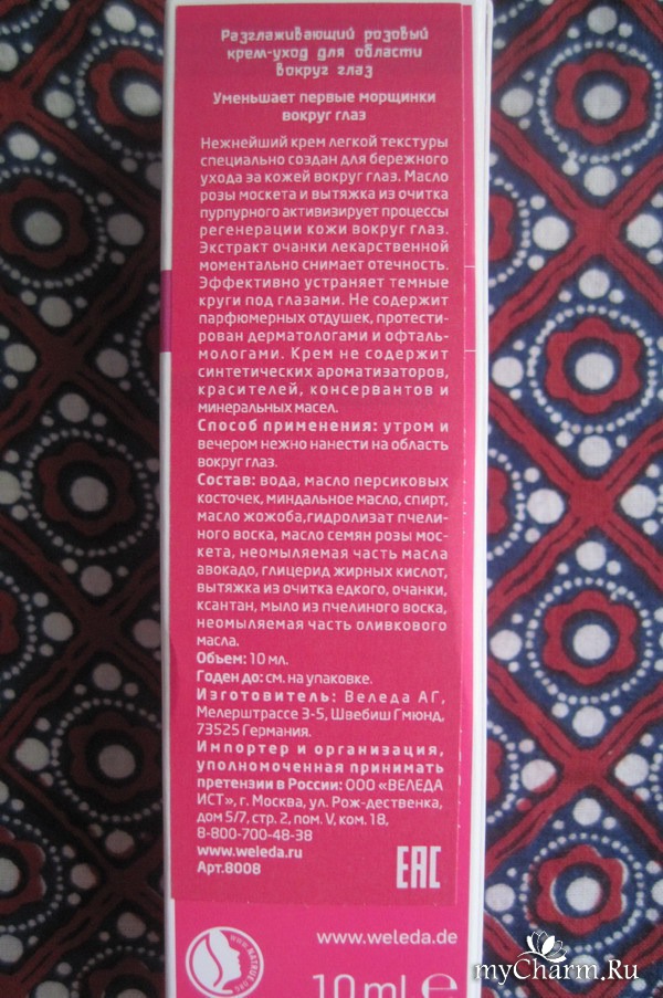 А вообще, в косметике, как и в медицине – проще предотвратить, чем победить. И для того, и для другого подходит натуральный крем для глаз Weleda. Полное название – разглаживающий розовый крем-уход для области вокруг глаз.
