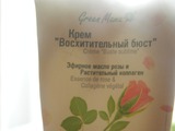 Крем "Восхитительный бюст" Эфирное масло розы и Растительный коллаген от Green Mama белого цвета, однородной консистенции, не жирный, но достаточно плотный. Запах у него странный: вроде травяной, и сначала даже приятный, но потом начинает отдавать чем-то кисловатым. Ни малейшего намёка на розу! Совсем. Как будто и нет её там. Лично меня это огорчило: выходит, производитель слукавил, когда писал о раскрытии женственности и естественной красоте, снятии усталости и прочем.