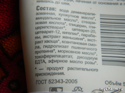 Но, нужно отдать должное, в составе Крема "Восхитительный бюст" немало других ингредиентов растительного происхождения: масло семян моркови, а также кунжутное и миндальное, экстракты женьшеня и хвоща, гидролизат пшеничного протеина – обещанный растительный коллаген - и кигелин - комплекс, который выделяют из плодов африканского растения кигелия – разновидности тыквы. Кстати, вещества, входящие в этот самый кигелин, по структуре близки к женским половым гормонам – эстрогенам, а значит, обладают ощутимым тонизирующим и укрепляющим действием. Возникает закономерный вопрос: почему об этом производитель распространяться не стал, зато обозначил действие эфирного масла розы, которого в составе продукта – кот наплакал?