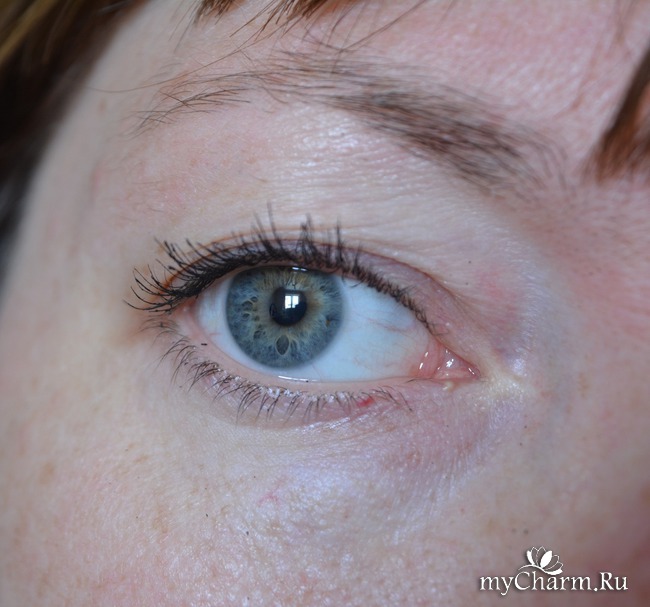 В два слоя появляются комочки. Тушь немного осыпается, оставляя частички на нижнем веке. Утяжеляет реснички. Разделяю их зубочисткой. "Паучьи лапки" меня не устраивают.