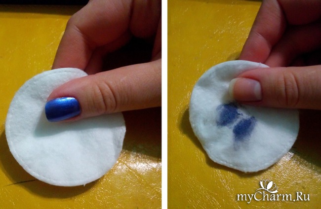 Как происходит снятие лака? Да, обычно! Без каких-либо проблем. Не нужно долго и с усилиями тереть ноготь. Смачиваем ватный диск вашей любимой жидкостью для снятия лака (у меня простая и недорогая, продается в любом магазине), прикладываем на несколько секунд к накрашенному ногтю и с небольшим нажатием ватным диском снимаем лаковое покрытие. Если возле кутикулы или по краю ногтя все-таки остались остатки лака, их без труда можно удалить тем же ватным диском или ватной палочкой.