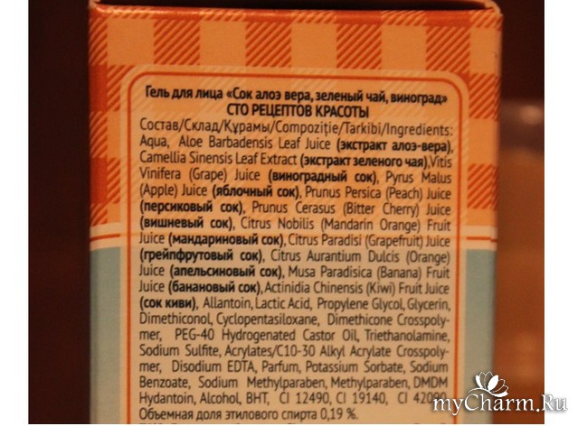 Первыми в перечне идут : экстракт алоэ-вера, экстракт зеленого чая, виноградный сок, яблочный сок, персиковый сок, вишневый сок, мандариновый сок, грейпфрутовый сок, апельсиновый сок, банановый сок, сок киви.