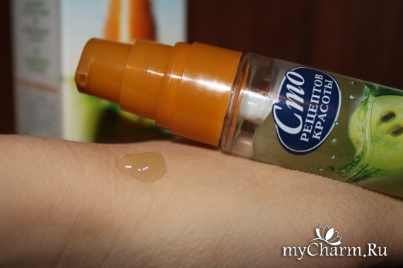 Итак, продолговатый флакончик исполнен из прозрачного пластика (внешне похож на стеклянный)и заканчивается оранжевым дозатором. На флаконе также есть изображение активных натуральных составляющих и описание их полезных свойств.