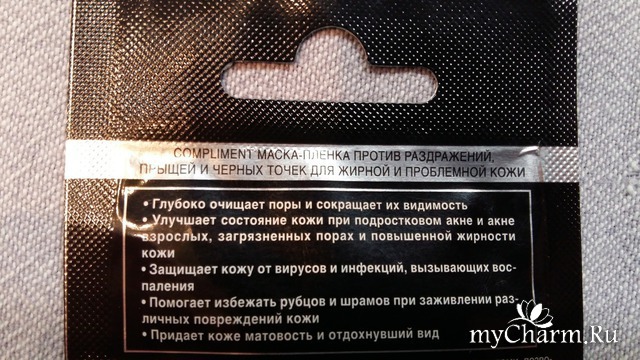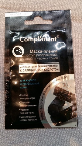 Думаю, маску для лица делала хоть раз в жизни каждая женщина, но вряд ли это был только один раз. Попробуешь однажды и потом уже сложно остановиться, хочется постоянно попробовать что-то новенькое. Тем более в наших магазинах косметики есть из чего выбрать, маски тканевые, сухие в виде порошка, в тюбиках и баночках, полноразмерные и пробники, выбирай на любой вкус и цвет, как говорится. О некоторых масочках, которыми я уже пользовалась, я рассказывала в своих обзорах, но это конечно же малая часть того, что я пробовала. Просто не всегда вспоминаю, что нужно все сфотографировать, а когда уже все вскрыла и использовала, тогда уже поздно, память девичья) Подсела последнее время на разные масочки, с их помощью быстренько можно привести свое личико в порядок. Особенно нравятся тканевые, но сегодня в моем обзоре речь пойдет о маске-пленке. А точнее о Маске-пленке для лица против раздражений, прыщей и черных точек от Compliment. Масочек от Compliment в моих запасах никогда не было, эту малышку я получила в открыточном новогоднем обмене от своей подружки Ирины (Ирина1980), о горчичном шампуне, который так же был в конверте я уже рассказала в своем недавнем обзоре. А теперь дошла очередь и до этой масочки. И так как до этого я ни разу не пользовалась масками-пленками, это был мой первый эксперимент. И забегая вперед скажу, эксперимент удался.