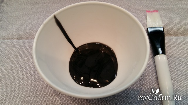 Так как не очень удобно маску наносить из пакетика, я его открыла и выдавила вот такую черную массу в мисочку. Аромат у маски очень приятный. Удобней мне такую маску наносить кисточкой.