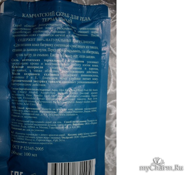 И ничего удивительного, ведь если внимательно разобрать состав, то там найдете масло оливы, экстракты водорослей, масло кедрового стланика, экстракт таволги и соль. На упаковке отмечено, что состав не включает SLS и парабенов. Да, их действительно нет. Также есть отметка о 100% натуральности ингредиентов. Только не будем обольщаться. Это не означает, что скраб абсолютно натуральный. Это акцент на наличие природных составляющих. И только.